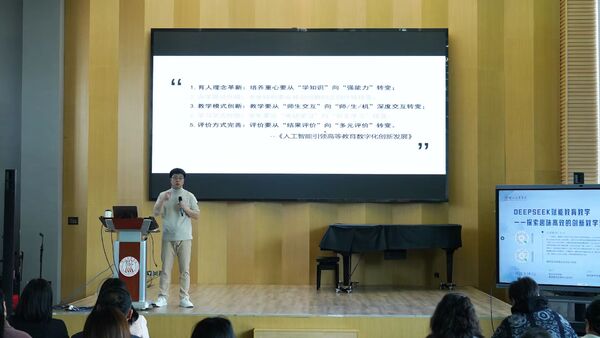 讲座内容不仅涵盖课堂教学革新,还延伸至教师科研与行政事务领域。李竹现场演示AI技术在文献检索、数据分析、论文撰写等科研环节的辅助功能,同时分享如何利用智能工具自动化处理日常事务性工作,有效减轻教师工作负荷,使其能更专注于教学科研主业。在互动环节,针对现场教师提出的"DeepSeek能否实现总谱自动生成分谱"等专业问题,他通过实时操作演示揭示了AI技术在音乐教学场景中的实践价值。