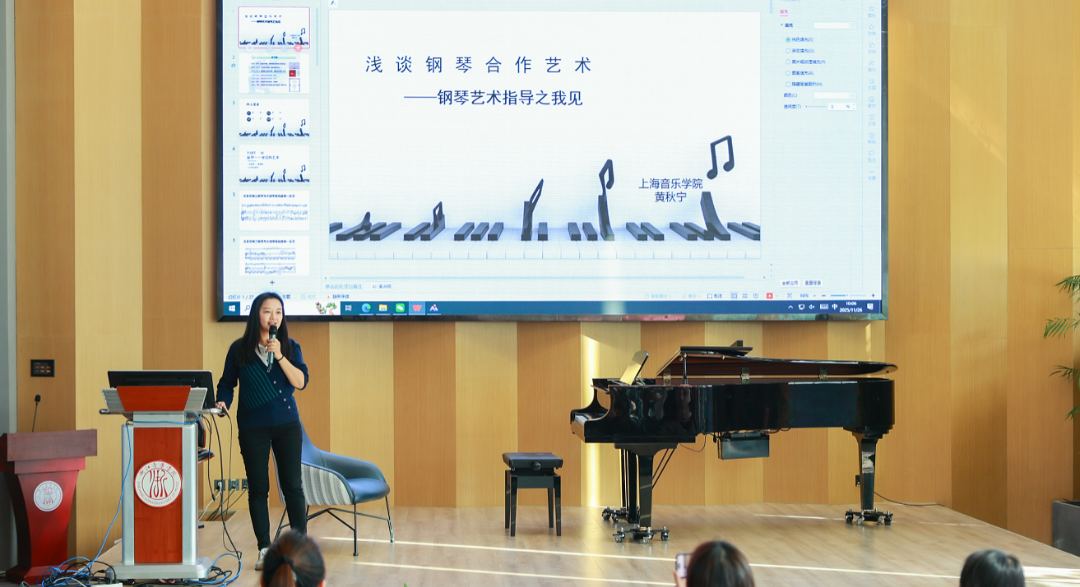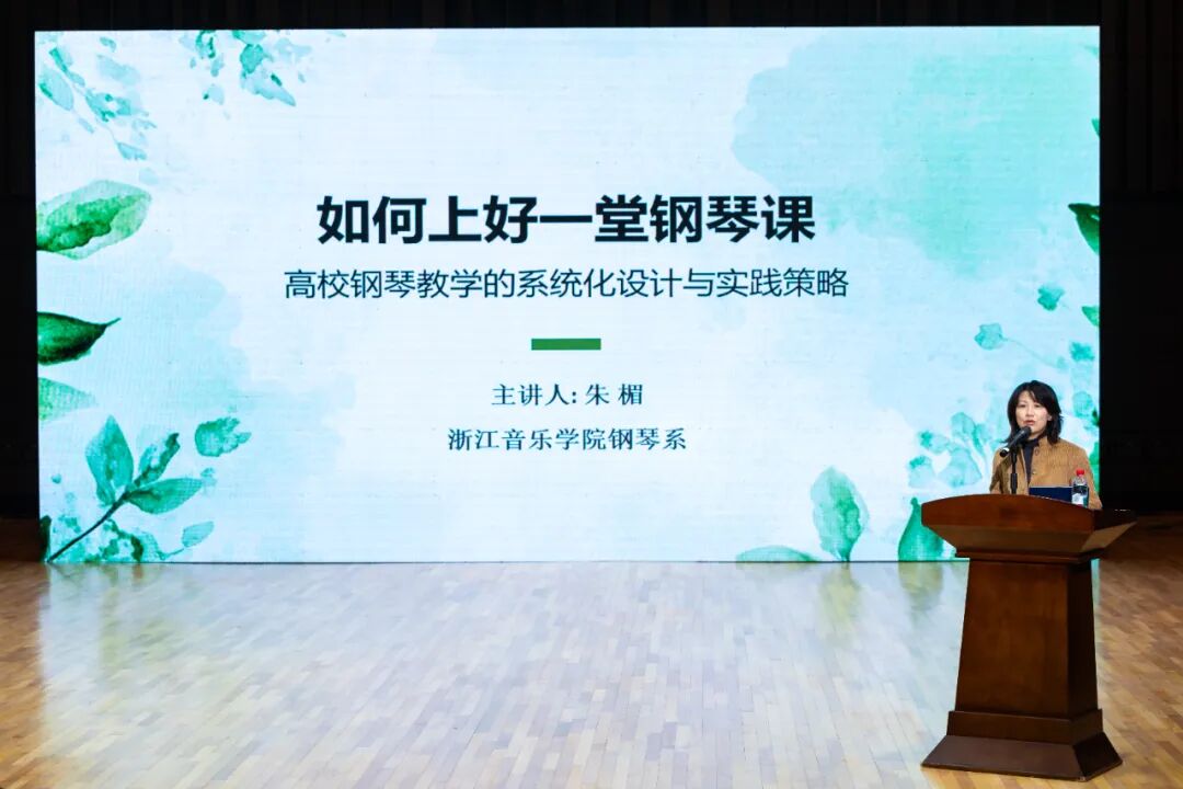 随后的名师讲坛与新秀讲坛环节聚焦艺术教学实践。学校第二届教学名师、钢琴系朱楣教授以《如何上好一堂钢琴课》为题,从 “课程目标精准定位、教学方法个性化设计、师生互动效能提升、艺术实践深度融合” 四个维度,阐述 “示范引领 — 问题导向 — 分层指导” 教学模式,强调钢琴教学需兼顾演奏技巧与审美素养培育。