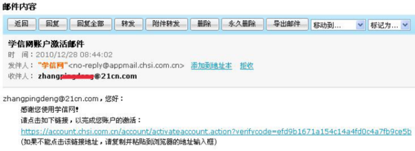 第三步:登录刚才注册的邮箱并打开学信网发来的激活邮件,直接点击激活链接(最好不要复制链接到其他浏览器打开):(如下图)