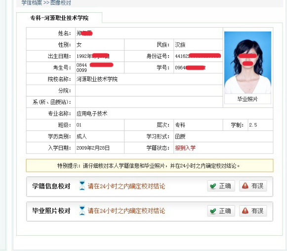 第七步:仔细核对学历相片是否本人,以及学号、姓名、身份证号、层次、考生号等有没有错误,如有误请点击有误按钮并输入正确的信息,如以上信息核对无误,请点击正确按钮,最后恭喜你,核对完成!
