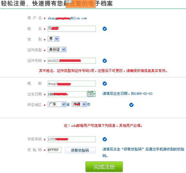 第四步:注册电子档案,输入自己的真实姓名、性别、身份证号码、昵称(可用自己的姓名拼音)、所在地区等,最后输入自己的手机号码并获取验证码,如果第一次获取验证码不成功,请在一个小时后重新登录邮箱点击账户的激活链接进行电子档案注册(如下图);
