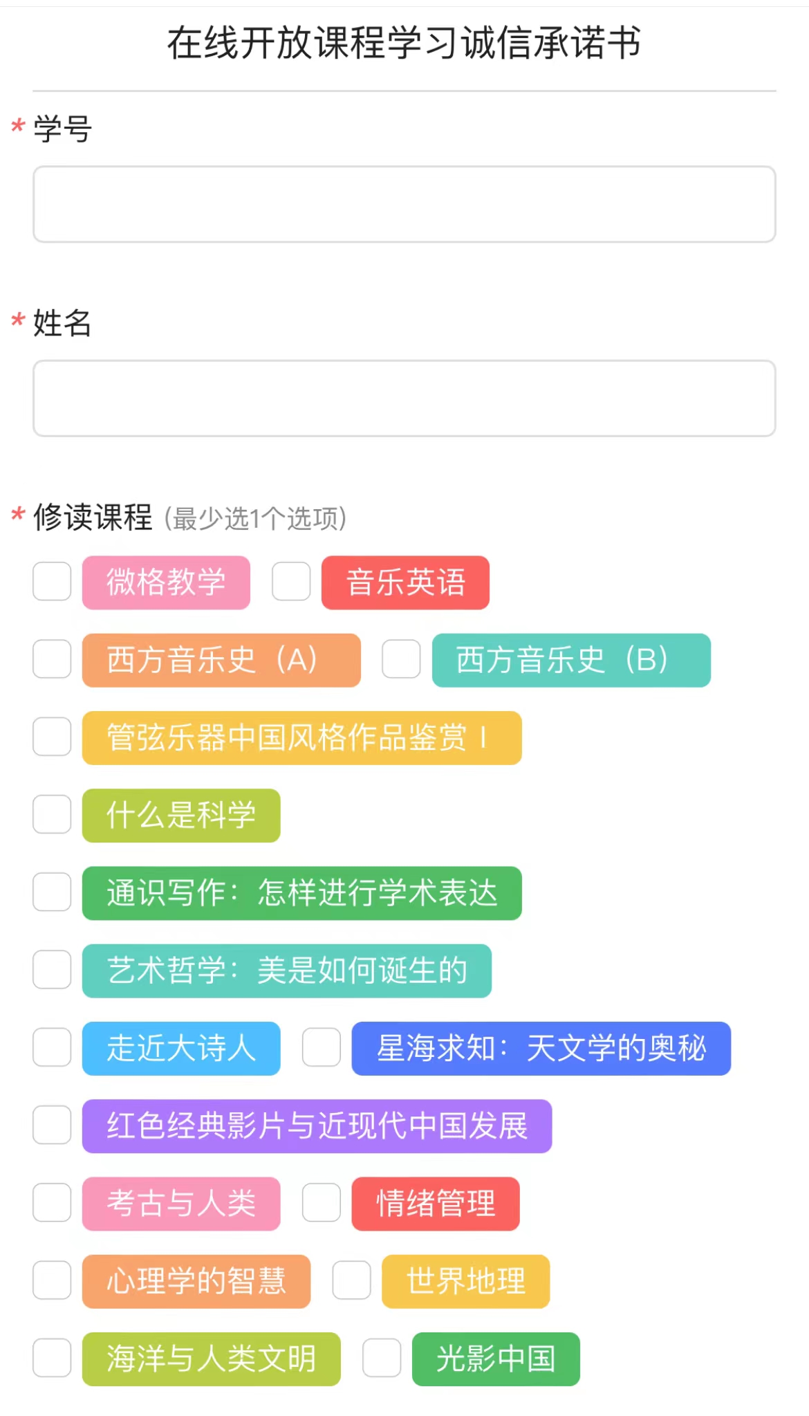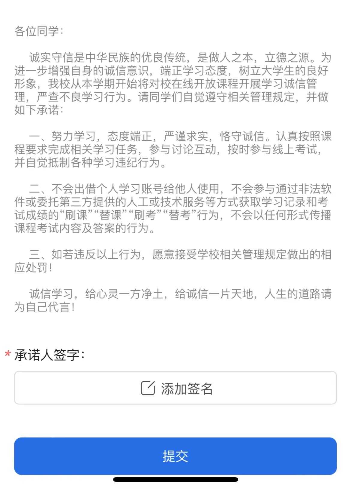 步骤二:进入界面,填写【学号】【姓名】,选择【修读课程】(可多选),认真阅读《在线开放课程学习诚信承诺书》,确认后点击【添加签名】后提交。