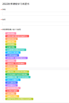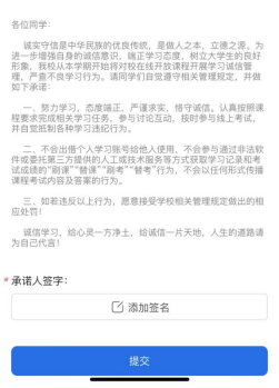 步骤二:进入界面,填写【学号】【姓名】,选择【修读课程】(可多选),认真阅读《在线开放课程学习诚信承诺书》,确认后点击【添加签名】后提交。