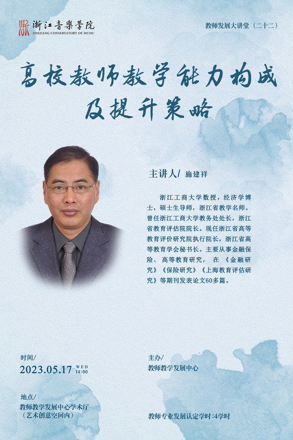 为提高专业建设水平,提升人才培养质量,教师发展中心邀请了浙江省教学名师、浙江省高等教育评价研究院执行院长、浙江省高等教育学会秘书长施建祥教授举办题为“高校教师教学能力构成及提升策略”的讲座。现将有关事项通知如下: