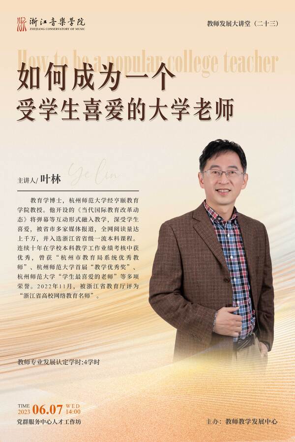 为提高专业建设水平,提升人才培养质量,教师发展中心邀请了教育学博士,杭州师范大学经亨顾教育学院叶林教授,举办主题为“如何成为一个受学生喜爱的大学老师”的讲座。现将有关事项通知如下: