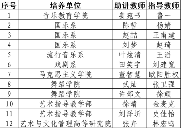 根据《浙江音乐学院青年教师助讲培养制度实施办法(试行)》(浙音〔2018〕61号)等文件精神,结合实际情况,经各教学单位推荐,现将第十二期青年教师助讲培养结对名单公布如下,详见附件。请各教学单位配合完成教师助讲培养工作。